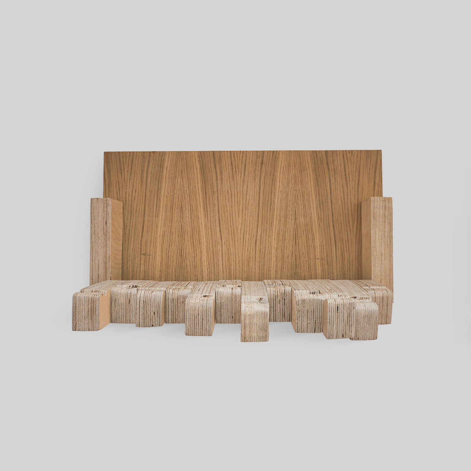 Cabide em madeira inspirado na arquitetura urbana, com suportes móveis ajustáveis. O seu design geométrico une arte e funcionalidade, oferecendo uma solução prática e elegante para organizar roupas e acessórios.